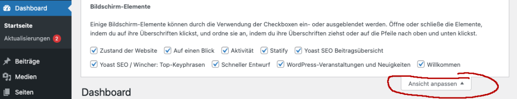 Aktualisierungen: Hier wird auf einen Blick angezeigt, ob eine neue WP Version vorliegt, oder Plugins oder Themes upgedatet werden müssen. - Beiträge: