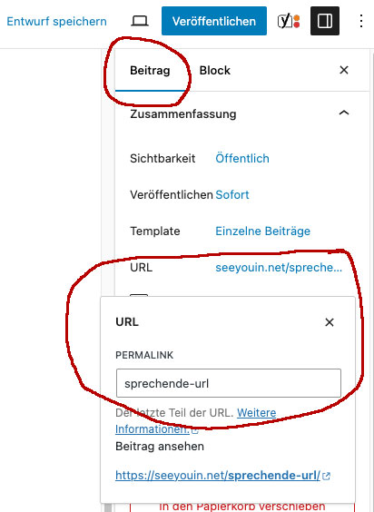 In dem eingekreisten Feld kannst du den Permalink abändern, wie es Sinn macht. Die einzelnen Wörter werden dabei mit einem Bindestrich verbunden. Es werden nur Kleinbuchstaben und Zahlen verwendet, und letztere auch nur, wenn du damit kennzeichnen möchtest, wie viele Tipps zu einem bestimmten Thema du in dem Beitrag gibst, zum Beispiel.