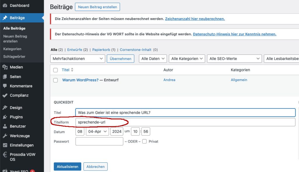 Eine weitere Möglichkeit zum Ändern der URL ist im Dashbord unter „Alle Beiträge“ die QuickEdit Option zu nutzen, die unter dem Beitragstitel erscheint, wenn man mit der Maus über den zu ändernden Beitrag fährt. Nach der Änderung „Aktualisieren“ nicht vergessen!